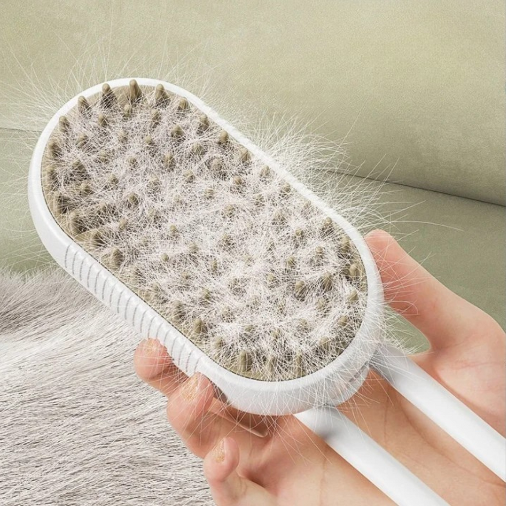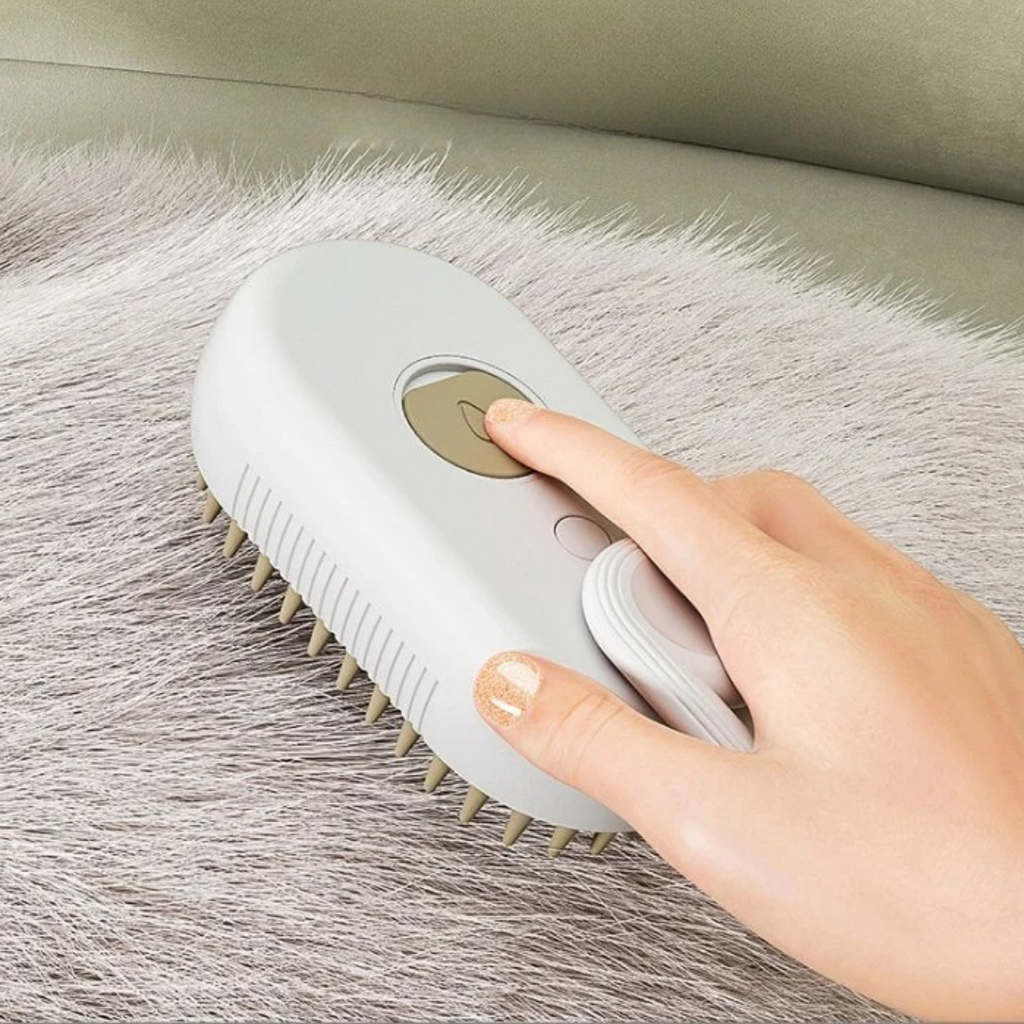 Podendo ser usada para limpar, arrumar emaranhados e massagear, a Escova Spray pode ser usada com água ou essência, soltando a borrifada ao apertar de um botão.